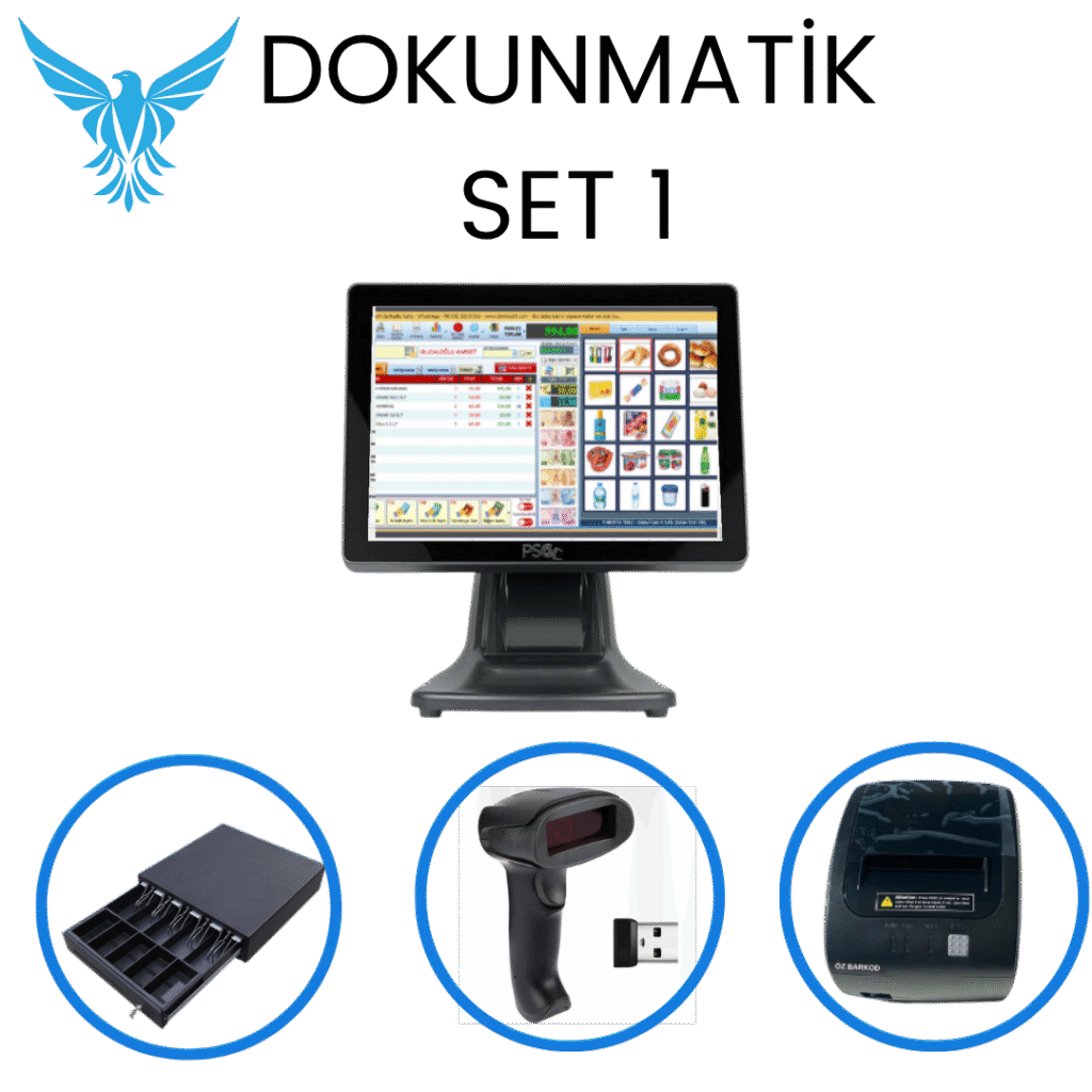 D Set 1 – Dokunmatik Pos PC + Para Kasası + 80mm Yazıcı + Barkod Okuyucu