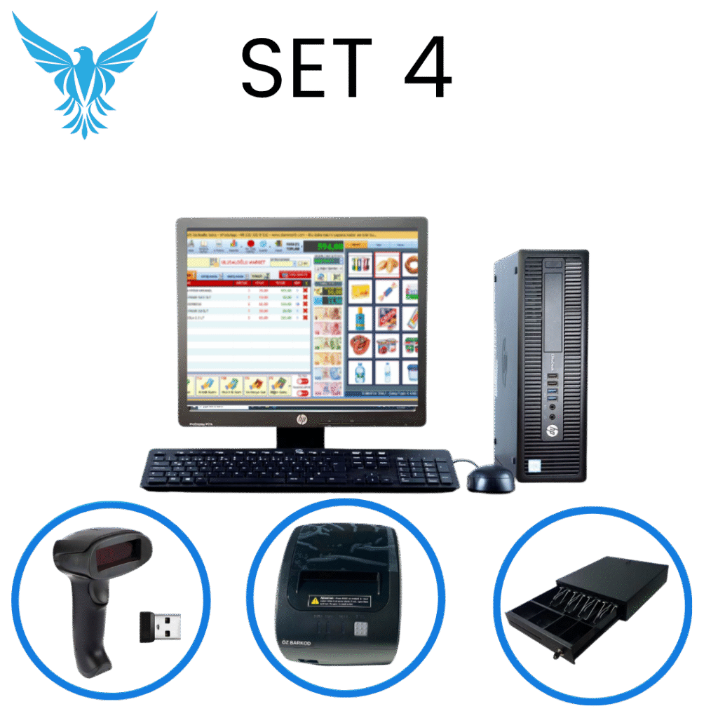 Set 4 – Barkod PC + Okuyucu + 80mm Yazıcı + Para Kasası + Program